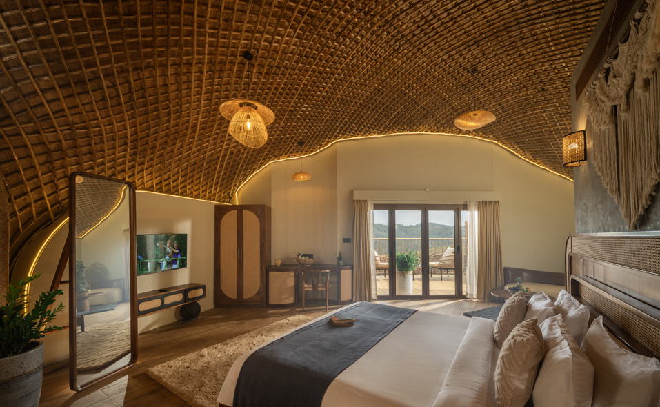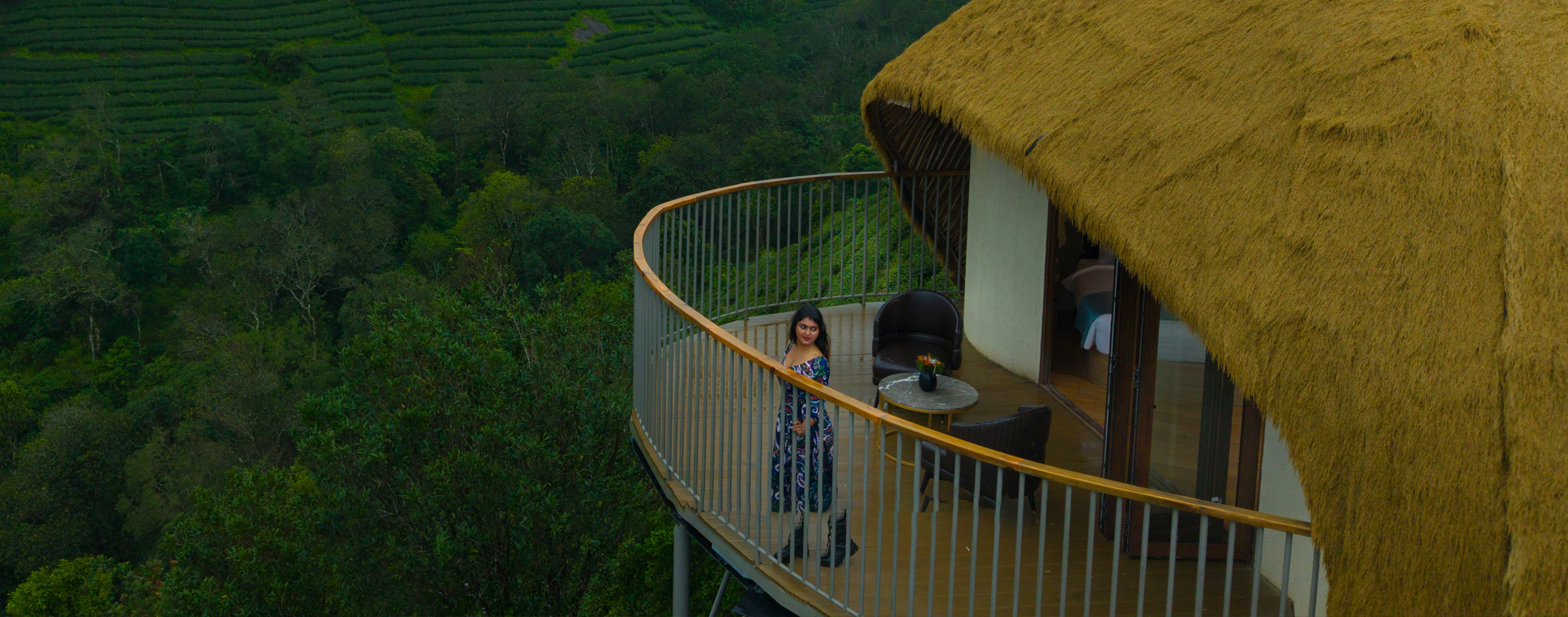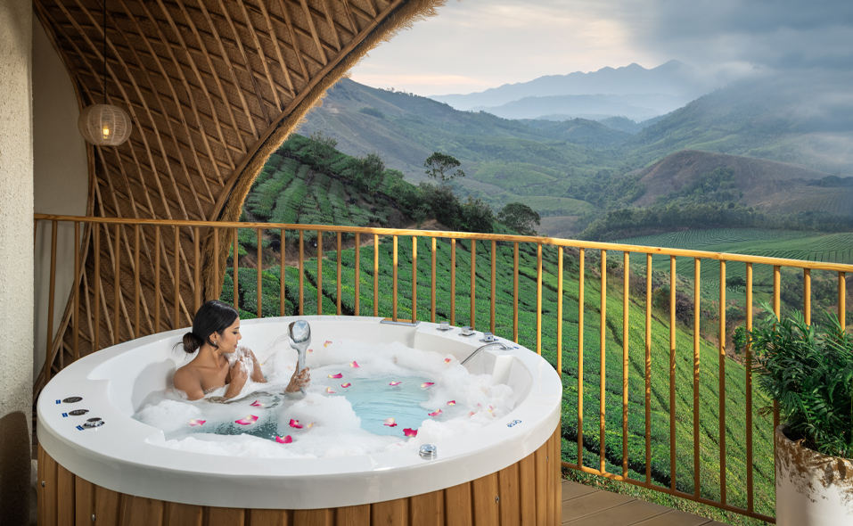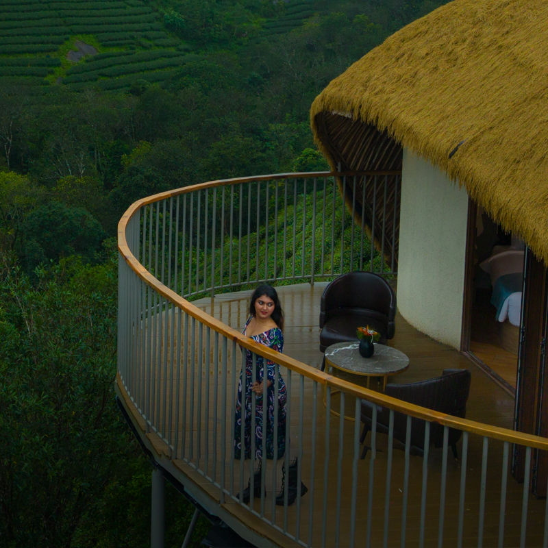 Perched at a height with sweeping “eagle-eye” views of rolling mountains and endless tea plantations, these cottages are among the most scenic stays in Vagamon. Inspired by Bali-style architecture, they feature eco-friendly construction with thatched grass roofs and natural materials that blend seamlessly with the surroundings