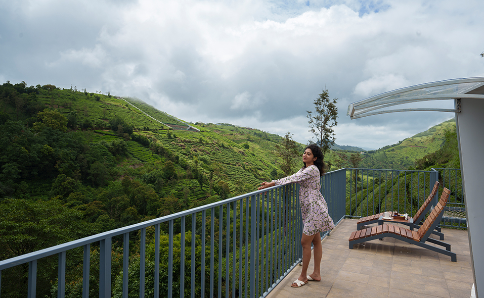 Private 250 sq. ft. balcony offering expansive views of the tea plantations and valley.